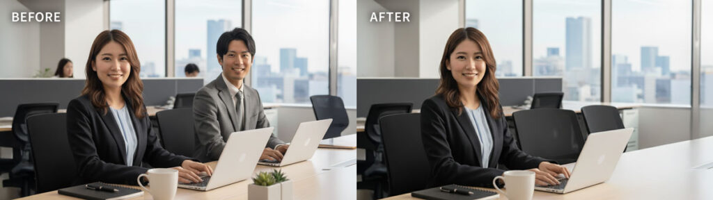 - 対談コンテンツでツーショット写真が欲しいけど、撮影日のスケジュールが合わないため別々に撮影して合成し、2人並んで撮影したような写真に仕上げる