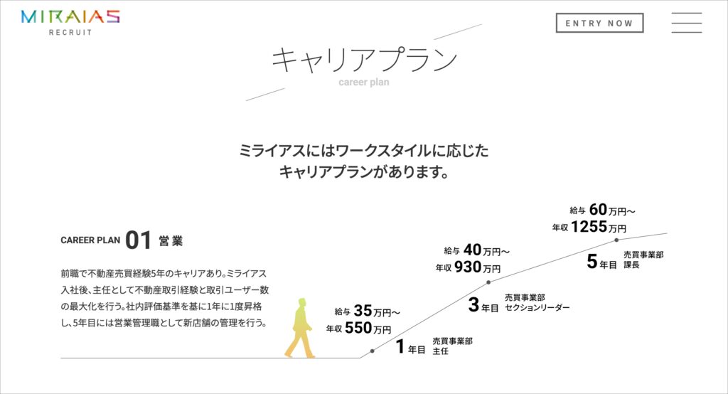 働く環境ページでは、キャリアプランや特徴的な制度を詳しく掲載。多くの求職者が不安に感じる点を具体的に掲載することで、「ここなら安心して働けそうだ」と思ってもらえるような情報設計としました。