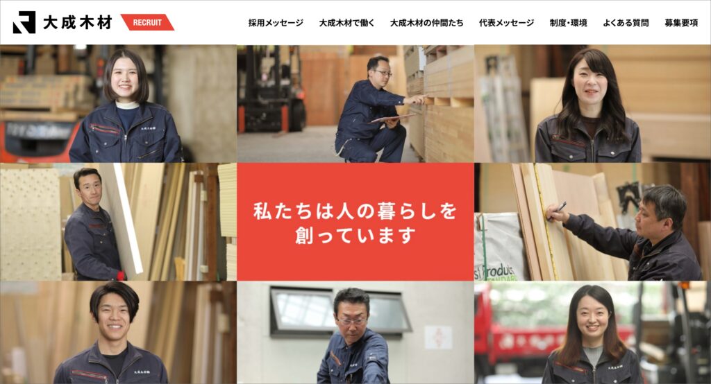 大成木材様が扱う”木材”のイメージをデザインに落とし込んだ採用サイトです。弊社では、幅広い業種の企業様の採用サイト制作実績があり、各業種の魅力が伝わるビジュアルを提案することが可能です。