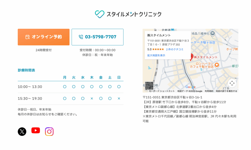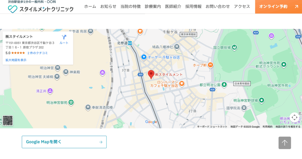 クリニックがどこにあるのか、家や職場から近く通いやすい場所にあるのかがすぐにわかると、来院へのハードルが下がります。 ホームページのトップページや、フッターなどの共通パーツに設置しておくことをお勧めします。