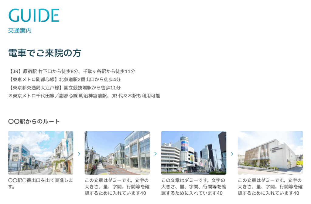ホームページを見て来院を決めた患者様にとって、体調が悪い時でも迷わずスムーズに来院できることが重要です。クリニックの所在地、交通手段、最寄駅などわかりやすいように案内することが大切です。