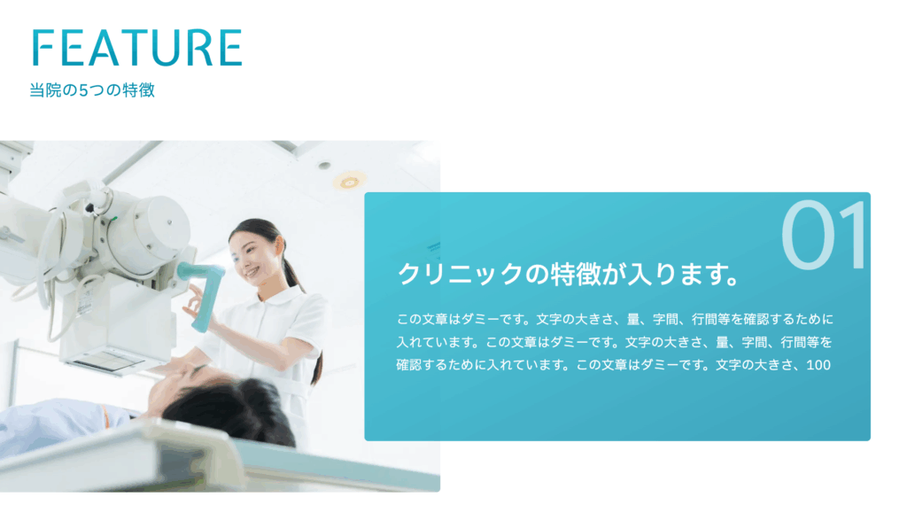 クリニックの雰囲気は患者様の安心感に直結します。素材写真ではなく、なるべくクリニックで撮影した写真を使うことで、「顔が見える病院」として信頼感を高めることができます。