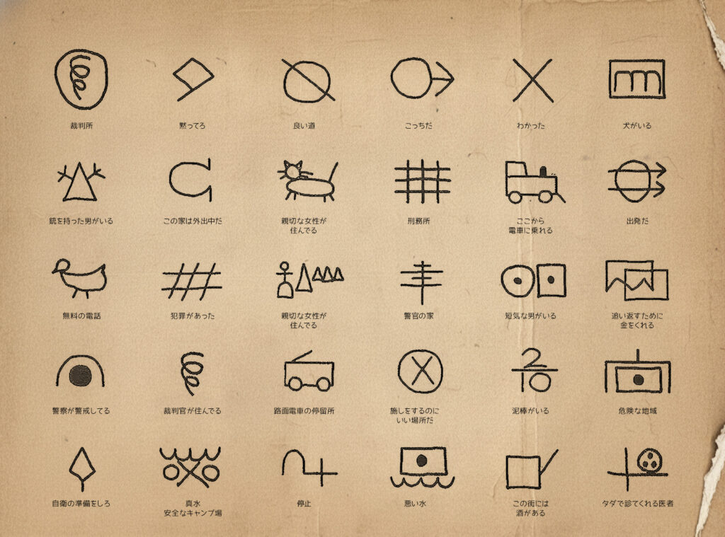 19世紀末のアメリカ、不況下で仕事を求めて移動生活をしていた労働者(ホーボー)たちは、仲間のために「秘密のマーク」を民家の塀や道路に残していました。 猫のマークなら「親切な女性がいる」、三角なら「危険」、ギザギザなら「犬に注意」。