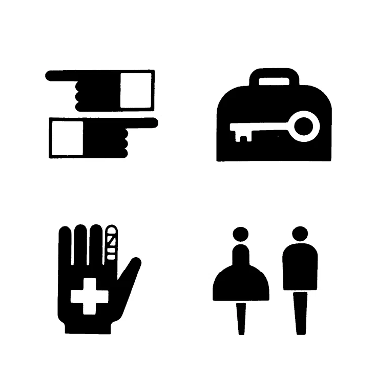 そして1964年。東京オリンピックには世界中から人が集まりましたが、当時の日本には英語の案内板がほとんどありませんでした。 「言葉が通じなくても、競技場所やトイレや食堂の場所を伝えたい」 そこで日本のデザイナーたちが考えたのが、アイソタイプの考え方を発展させ、より直感的な「ピクトグラム」を施設中に配置しました。