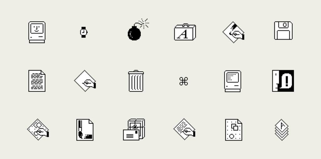 1984年、初代Macintoshの登場はアイコンの歴史における革命でした。 デザイナーのスーザン・ケアは、粗いドット絵の中に「温かみ」を吹き込みました。起動時の「ハッピーマック(笑顔のパソコン)」や、エラー時の「爆弾」。 冷たい計算機だったコンピューターに「人間味」や「ユーモア」というUIを与えた彼女の仕事は、今の私たちがアプリに親しみやすさを感じる原点になっています。