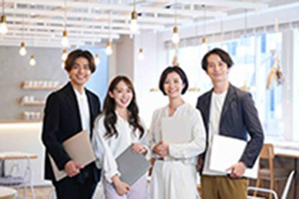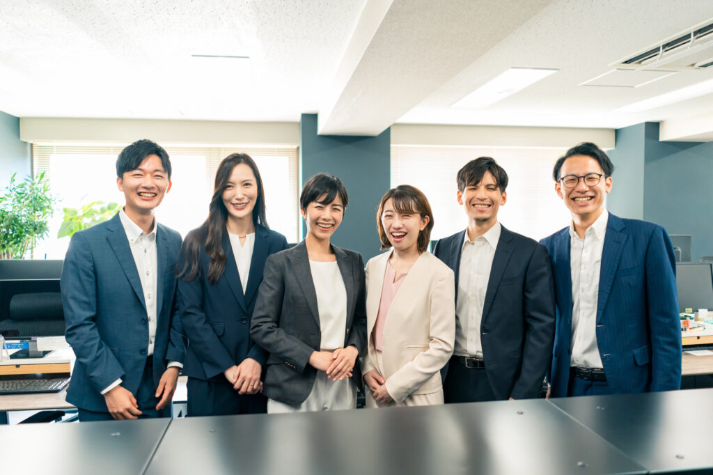 集合写真も、職場で働く人たちの雰囲気を伝えるために有効な写真です。ただし、遠慮して人と人の間が空きすぎると、仲が良くなさそうに見えることがあります。もう一歩距離を詰めて、チームの一体感を伝えましょう。