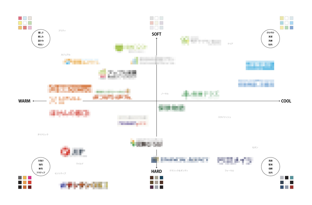 同じ規模や事業領域を持つ競合他社をピックアップし、そのロゴデザインをマトリックス上に配置することで、デザインの傾向やポジショニングを視覚化しました。 - ロゴのトレンド分析