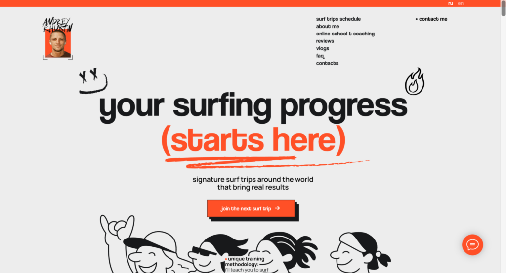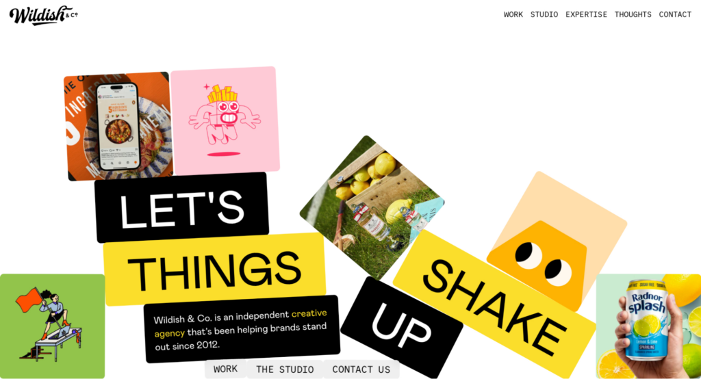 上記のサイトは、写真やテキスト、ボタンといった要素が、積み木のように重ねられたデザインです。キャッチコピーやメニューのリンクといったUI要素までもがグラフィックの一部として扱われており、遊び心が素敵なサイトです!